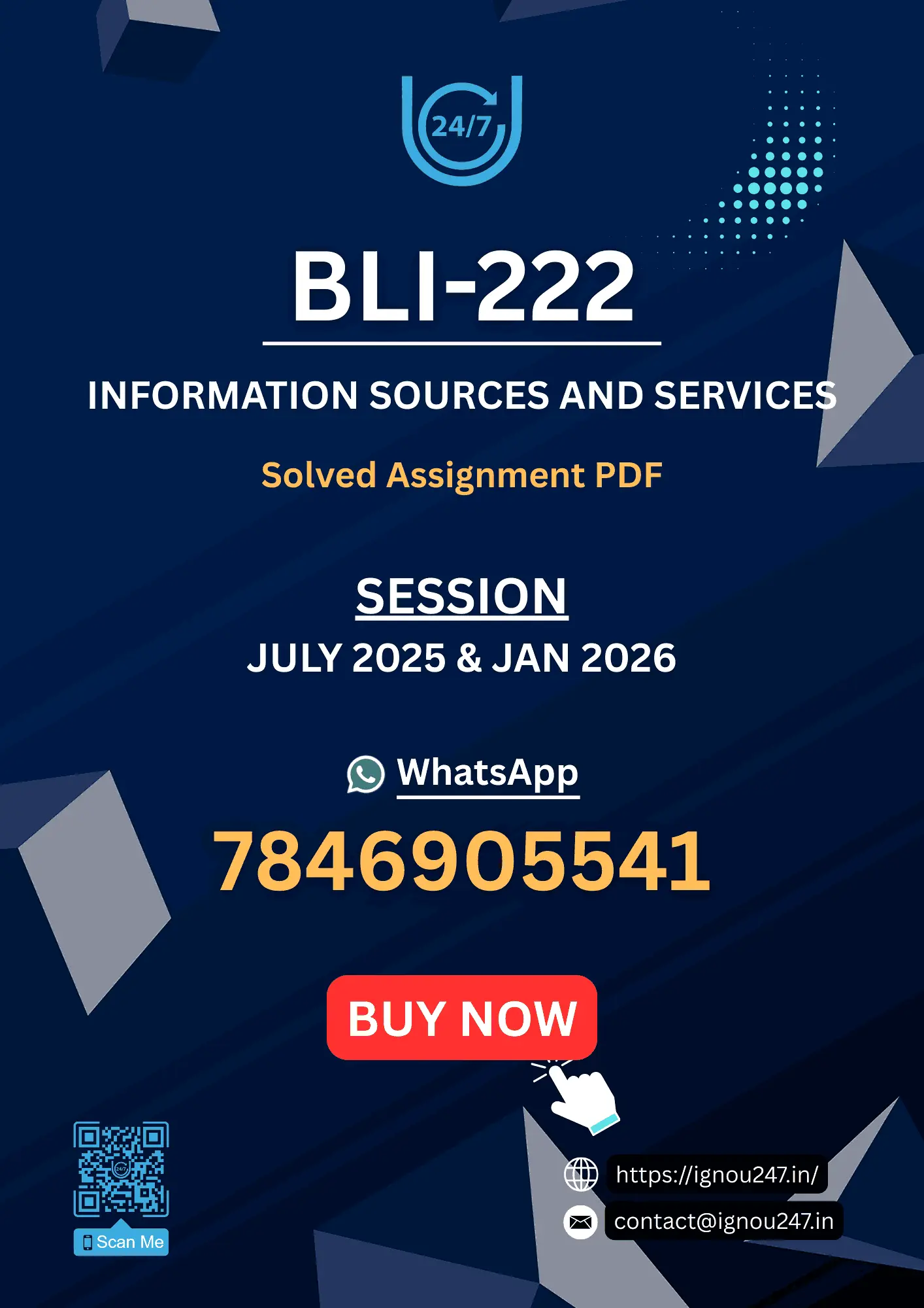 Get the IGNOU BLI 222 (INFORMATION SOURCES AND SERVICES TUTOR MARKED ASSIGNMENT) solved assignment for 2025–26. Based on IGNOU’s latest guidelines and official books. Includes complete answers, structured format, and diagrams. Valid for both July 2025 and January 2026 sessions. Instant PDF download.