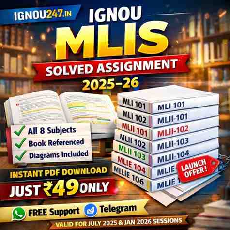 Get the IGNOU MLIS Solved Assignment Combo for 2025–26 (All 8 Subjects). Prepared strictly as per IGNOU’s latest guidelines and official study materials. Includes complete, book-referenced answers, proper structure, word-limit compliance, and relevant diagrams. Valid for July 2025 and January 2026 sessions. Instant Secure PDF Download – Launch Offer: ₹49 Only.